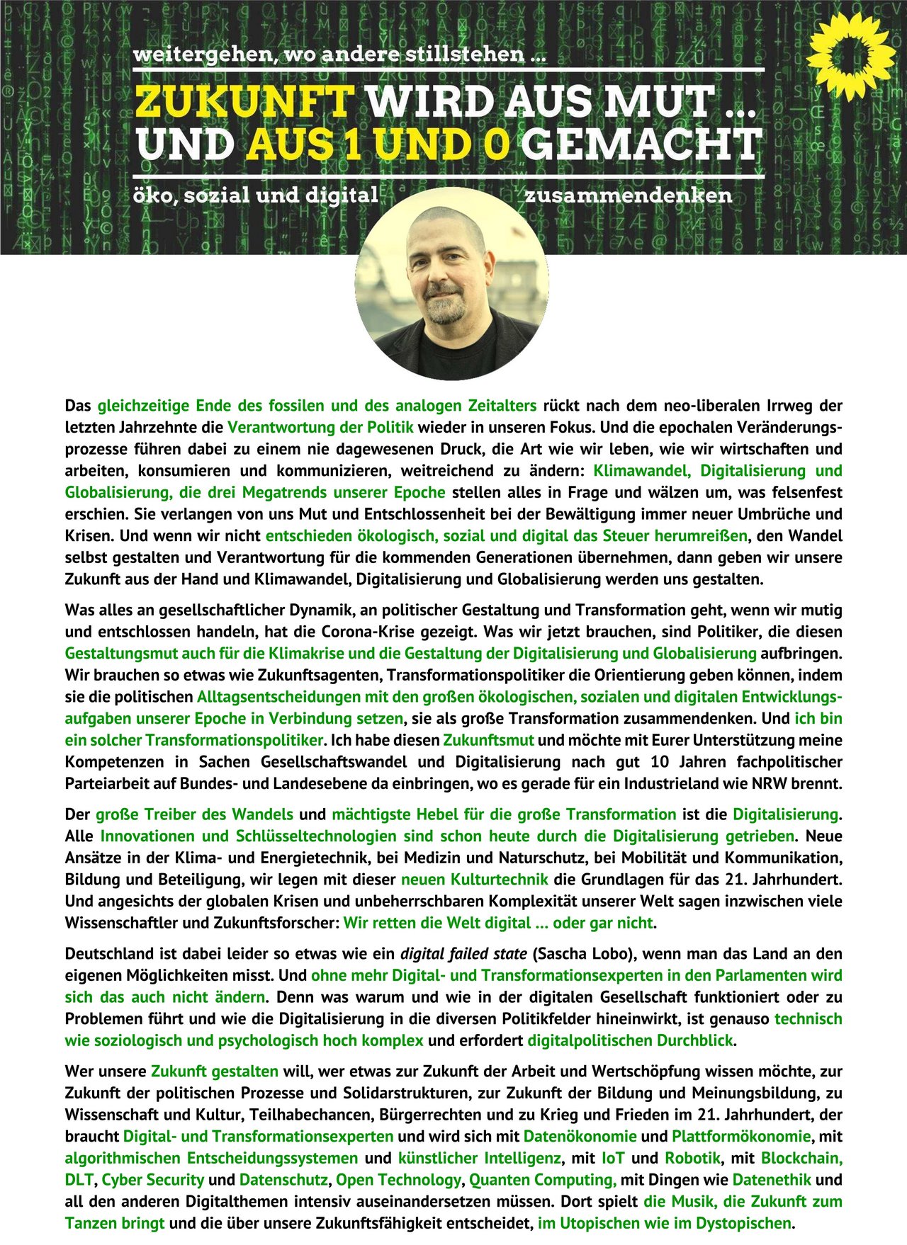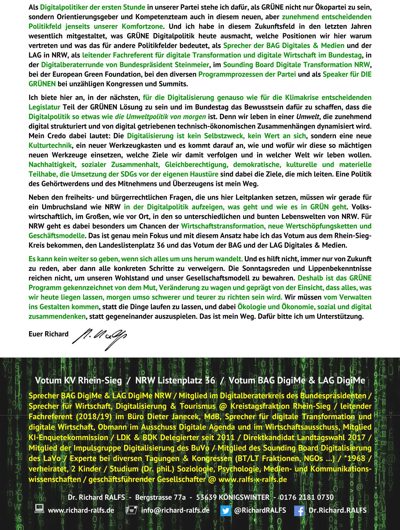 Zu meiner Kandidatur zur Bundestagswahl für den Wahlkreis Rhein-Sieg II (WK 98) und mit Listenplatz 36 der GRÜNEN NRW habe ich eine eigene Wahlkampfseite erstellt zu der es hier geht.